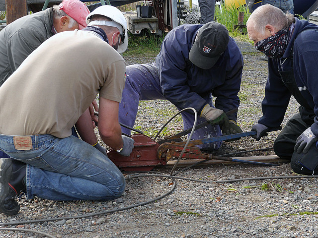 Erst gab’s bei der unteren Kolonne (wieder mal) ein Problem mit den Umlenkrollen der Querzugwinde – dann wurde bei der oberen Kolonne ein Boot im Eifer des Gefechts über die Kreuzung gezogen. Glücklicherweise kam das Boot noch vor der Messe zum Stehen – sonst hätte Sagitta in diesem Jahr die Ausstellungssaison in der Messer eröffnet …