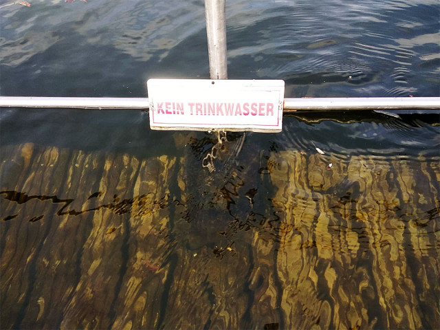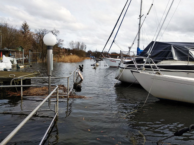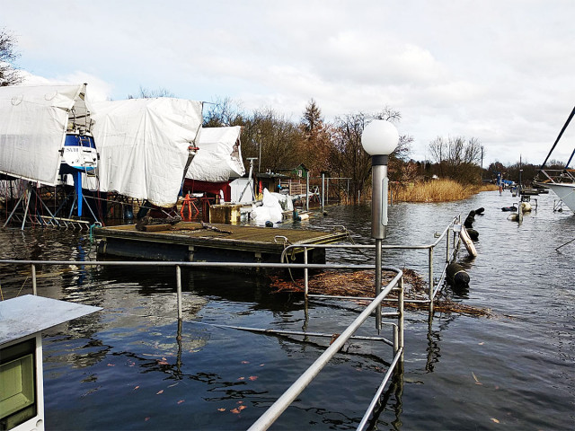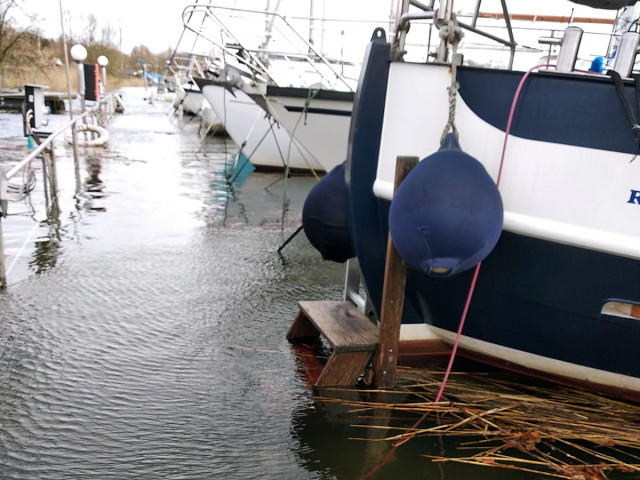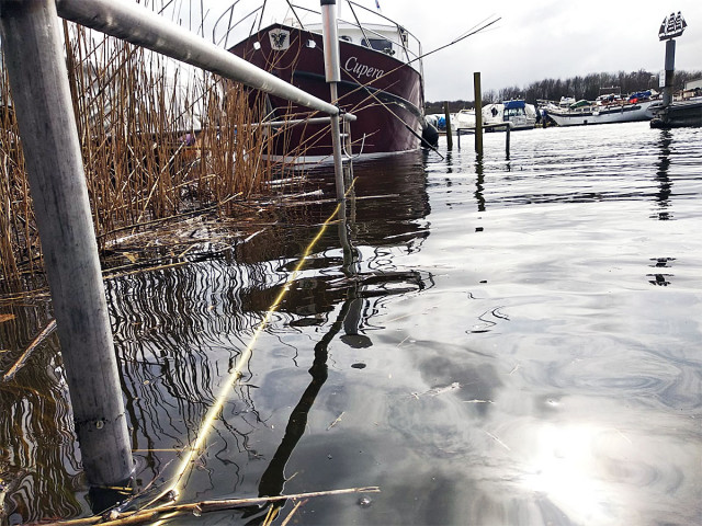 Wenn das Wasser dann aber weiter steigt, verändert sich die Situation: Mit jedem Zentimeter, den das Wasser wird es im wahrsten Sinne des Wortes eng, wenn die Festmacher ein bisschen sehr kurz sind. Dann beginnen die nämlich, das Boot langsam aber sicher unter Wasser zu ziehen. Und wenn der Auspuff erst mal unter Wasser gezogen ist, besteht latent die Gefahr, dass das Boot absäuft. Und das will man als Eigner eher nicht haben.