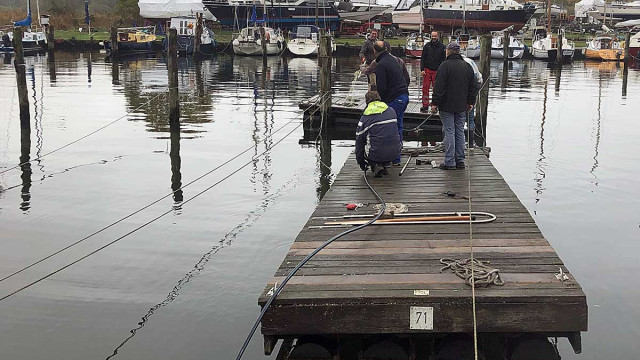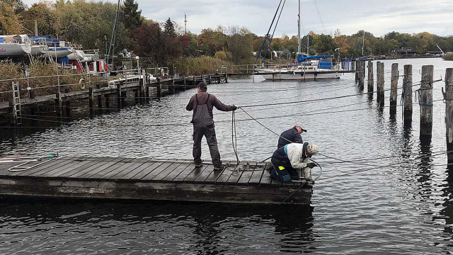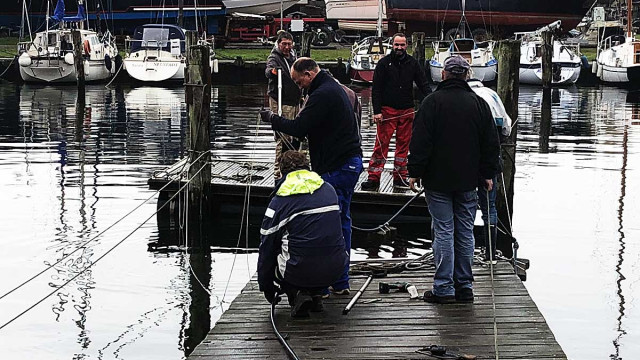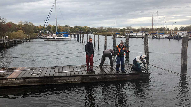 Dank dem außergewöhnlichen Einsatz der Sportskameraden ist das tatsächlich an dem einen Wochenende geschehen! Eine großartige Leistung, die es uns jetzt ermöglicht, die Pfähle tauschen zu lassen. Diese Arbeiten beginnen Anfang November, zunächst mit dem Austausch der Führungspfähle des Schwimmstegs.