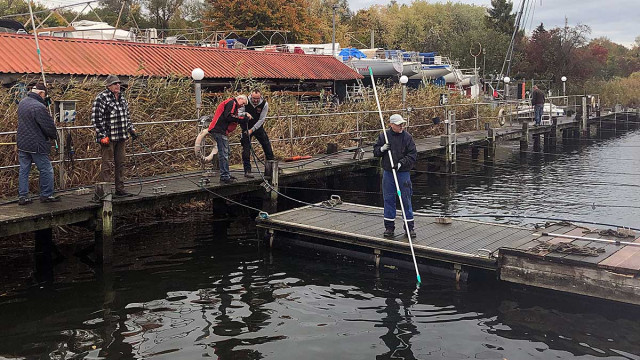 Der Sonderarbeitsdienst am 31. Oktober hatte „nur“ dieses eine Ziel: Austausch der alten Schläuche, durch die wir im Winter Druckluft blasen, um so den Austausch der Wasserschichten zu befördern – und so nebenbei wirkungsvoll das Zufrieren unserer Steganlagen verhindern.