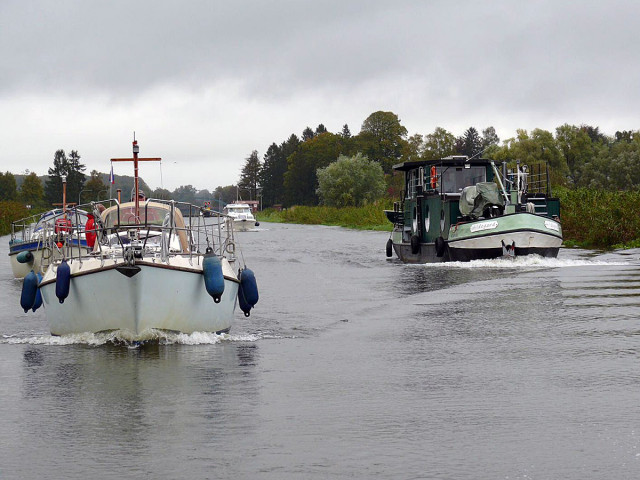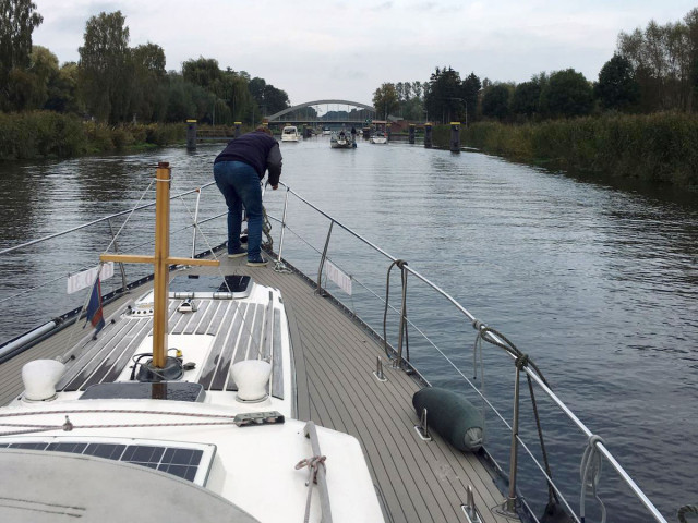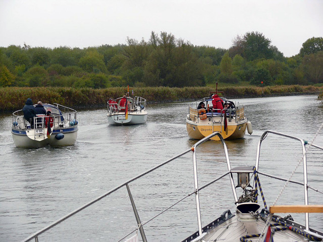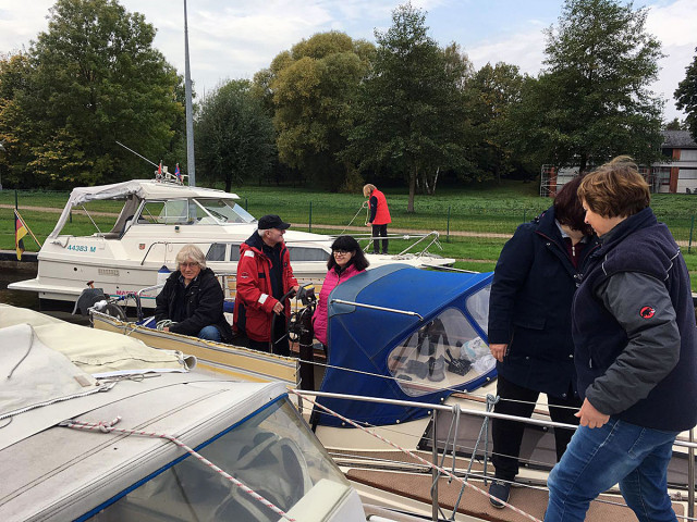 Am Morgen dann noch ziemlich niedriges Wasser. Der Pegel zeigte 4,70m an, dazu der angekündigte Nieselregen. 9 Uhr Ablegen, was schert uns das Wetter. Die Flotte bestand aus den Booten „Jette“, „Sedina“, „Roberta“, Rhapsodie“ und die „Merula“. Die „Ingrid“ wartete schon in Mölln auf uns. Unter der Hubbrücke hindurch eroberten wir die Binnenwasserstraße und nahmen alle Schleusen mit Bravour. Immerhin bis Mölln ein Anstieg von fast 12 Metern. Büssau 1,50m, Krummesse 2,75m, Berkenthin 1,75m, Behlendorf 1,65m und die Donnerschleuse 4,18m. Aus der Tierwelt zu beobachten: Kraniche, Kormorane, Bussarde, Rehe, Kühe, Hunde und Enten.