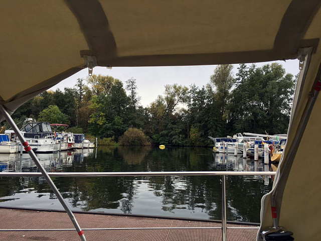 Am Sonntag, zeitweise trocken, mehrmals kurz fast sonnig, machten wir uns um 10 Uhr auf die Heimfahrt. Unterwegs gab es dann noch einmal einen heftigen Schauer, der allmählich in ausdauernden Nieselregen überging. Ab dem LMC wurden unterschiedliche Wege gewählt, je nach Tiefgang oder Durchfahrtshöhe, durch den Stadtgraben, vorbei an Ober- und Untertrave, oder eine Kombination dieser Möglichkeiten. Die „Merula“ wollte testen, ob sie noch unter der Drehbrücke hindurchpasste. Bei einem Pegelstand von mittlerweile 5,18m waren noch etwa 10cm Luft nach oben. Am Nachmittag erreichten nach und nach alle Teilnehmer den ESVHL. Das Wetter hätte besser sein können, aber immerhin war es nicht kalt.